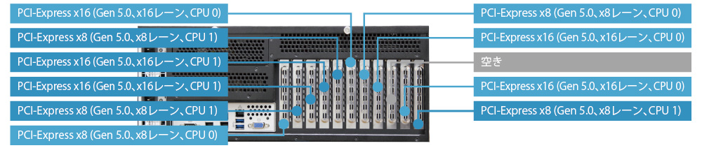 PCIe 5.0 x16スロット5基とPCIe 4.0 x8スロット5基の合計10スロットを搭載。マシンビジョンシステムや画像検査装置に必要な各種拡張カードを柔軟に組み合わせて搭載できます。