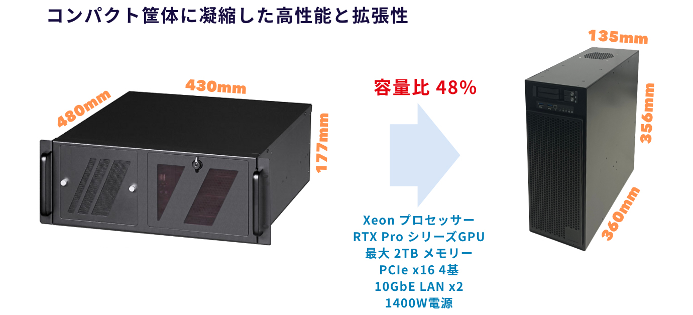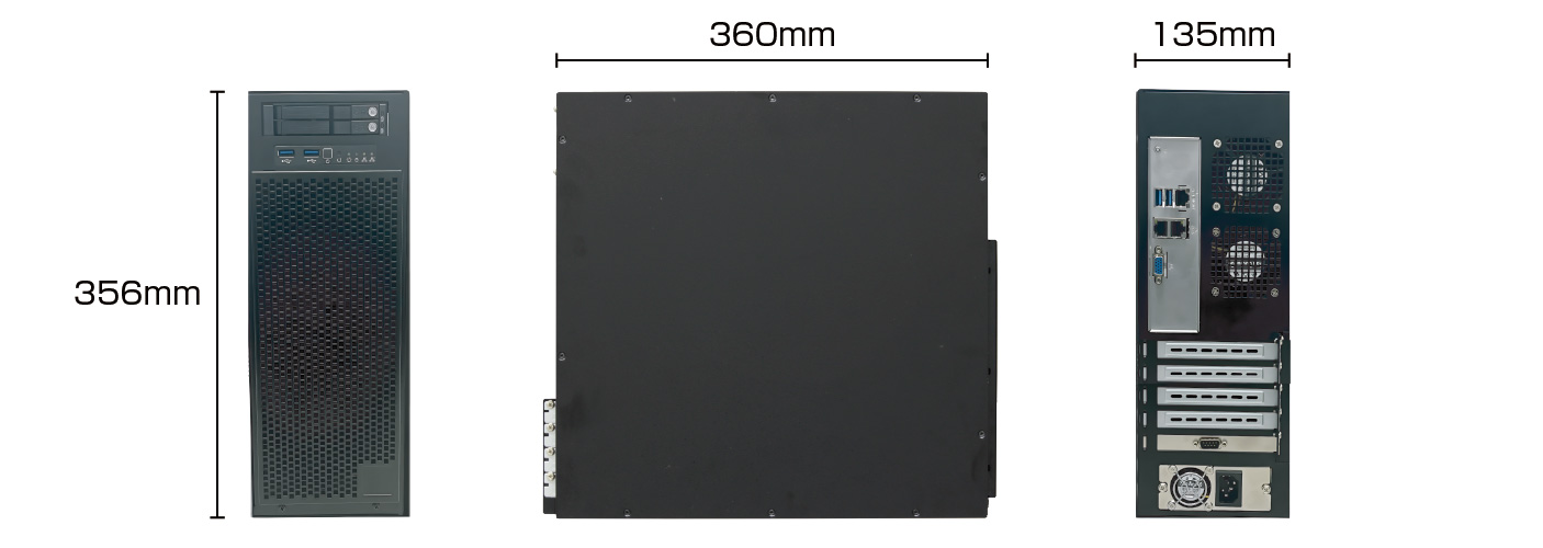 幅わずか135mm、高さ356mm、奥行き360mmという寸法は、同等の性能を持つ一般的な4Uラックマウント製品と比較して、容積比で約48%にまで削減されています。