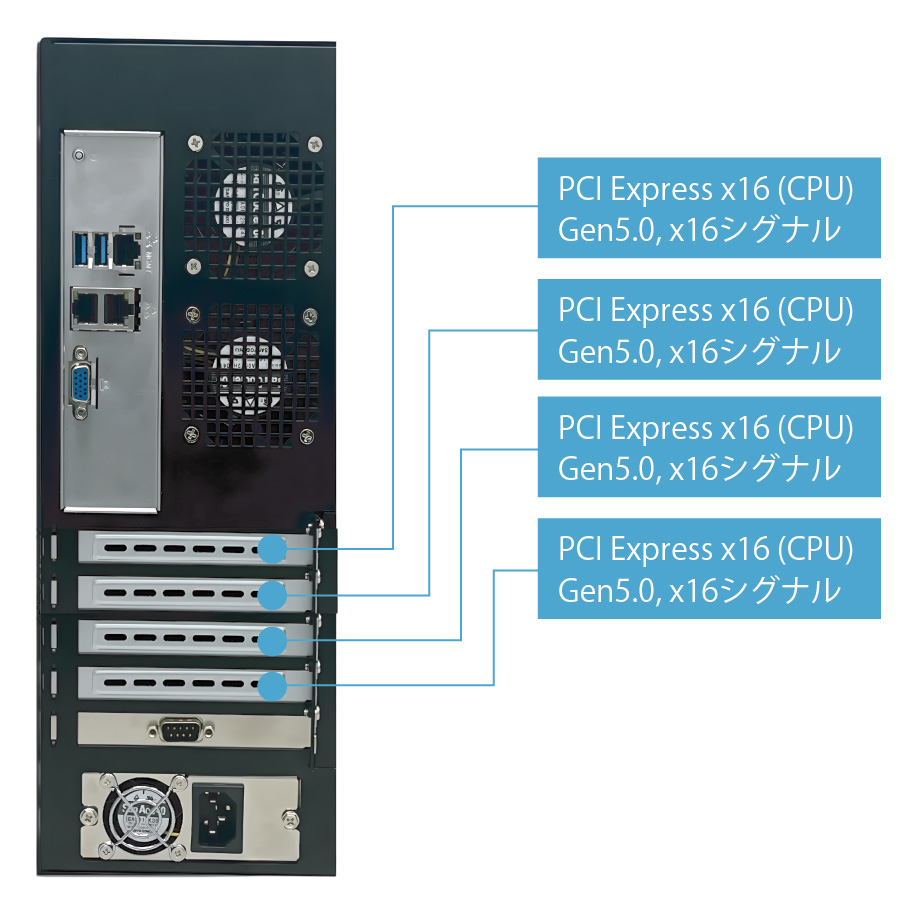 筐体内部の冷却機構は、350WクラスのCPUと最大2基の高性能GPU(200W以下の場合)が発する熱を効率的に排出するよう設計され、長期連続稼働にも対応できる冷却性能を確保しています。