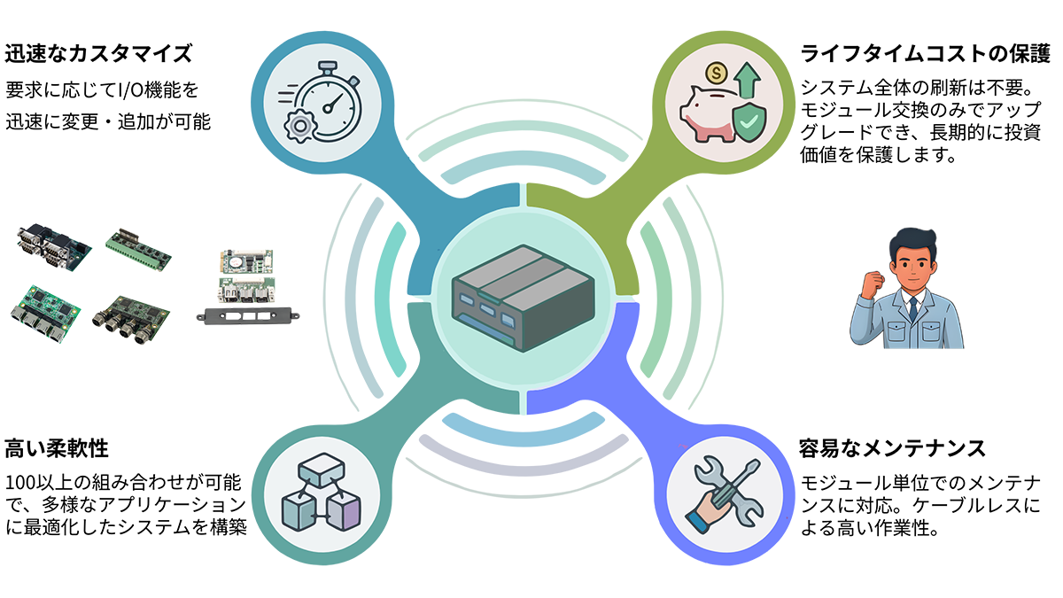 従来の産業用PCは固定仕様のため、多様化・複雑化する要求への個別対応が課題となっていました。モジュラーコンセプトは、継続す る土台と進化する機能を分離することで、ライフサイクル全体のコストを削減し、変化に柔軟に適応できるシステムを実現します。迅速なカスタマイズ、投資価値の保護、容易なメンテナンス、高い柔軟性——この4つの価値を軸に、産業用システムの常識を変えます。
