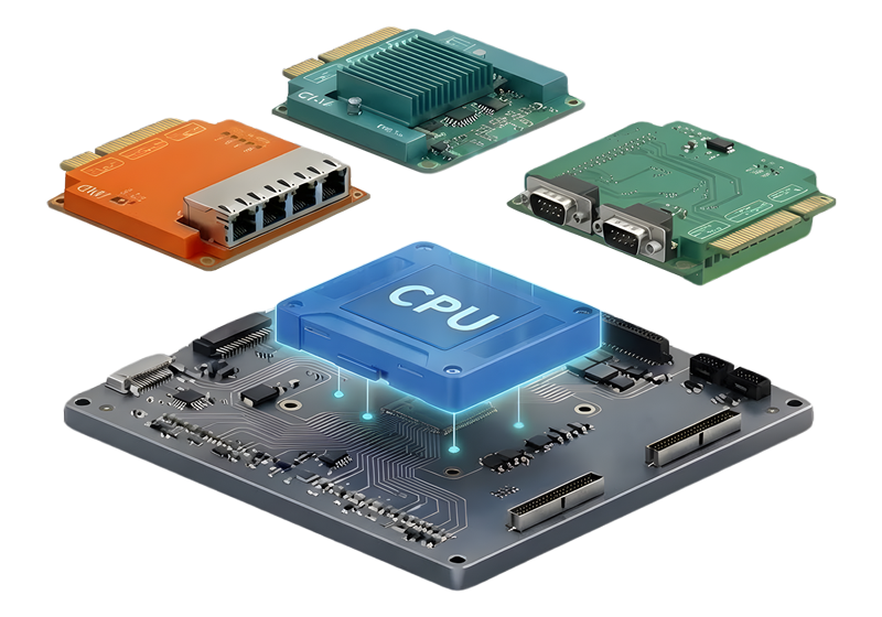モジュラーコンセプト製品は、独自のCMI (Combined Multiple I/O)、CFM (Control Function Module)、およびMEC (Mini-PCIe