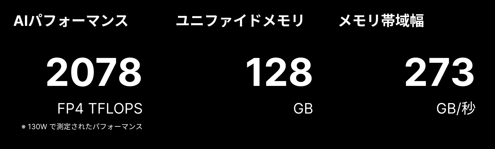 | メモリ | 容量・規格: 128 GB 256ビット LPDDR5X 帯域幅: 273 GB/s |