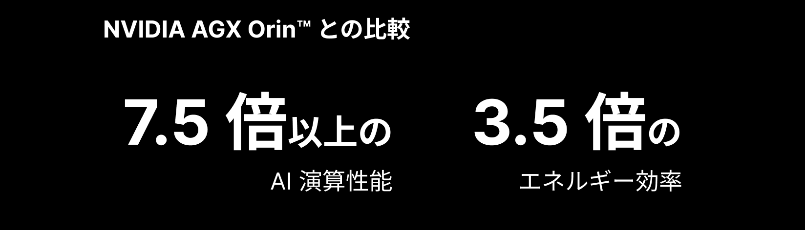 従来のNVIDIA Jetson AGX Orin™と比較して、AI演算性能は最大7.5倍、エネルギー効率は3.5倍向上しています。