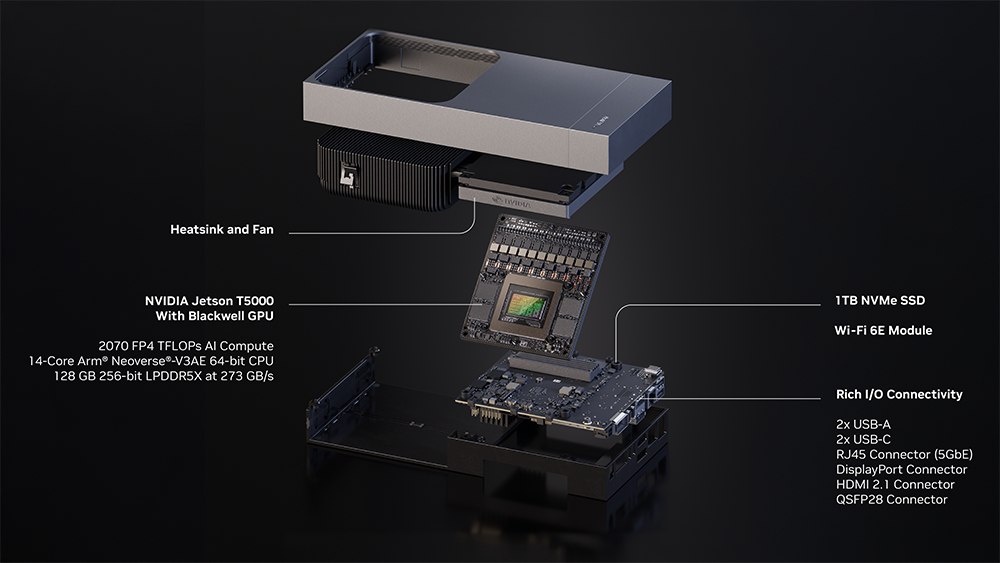 CPUは14コアArm Neoverse-V3AE(最大2.6GHz)を搭載し、前世代比で3.1倍の性能向上を実現。メモリは128GB LPDDR5X(273GB/秒)のユニファイドメモリアーキテクチャを採用し、CPUとGPUが静的パーティショニングなしで全メ モリにアクセス可能です。